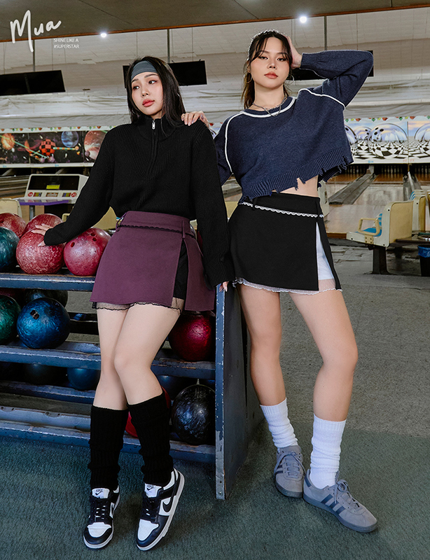 MUA!秋冬辣妹高腰異材質拼接短裙(附褲) 中大尺碼裙子