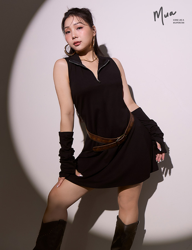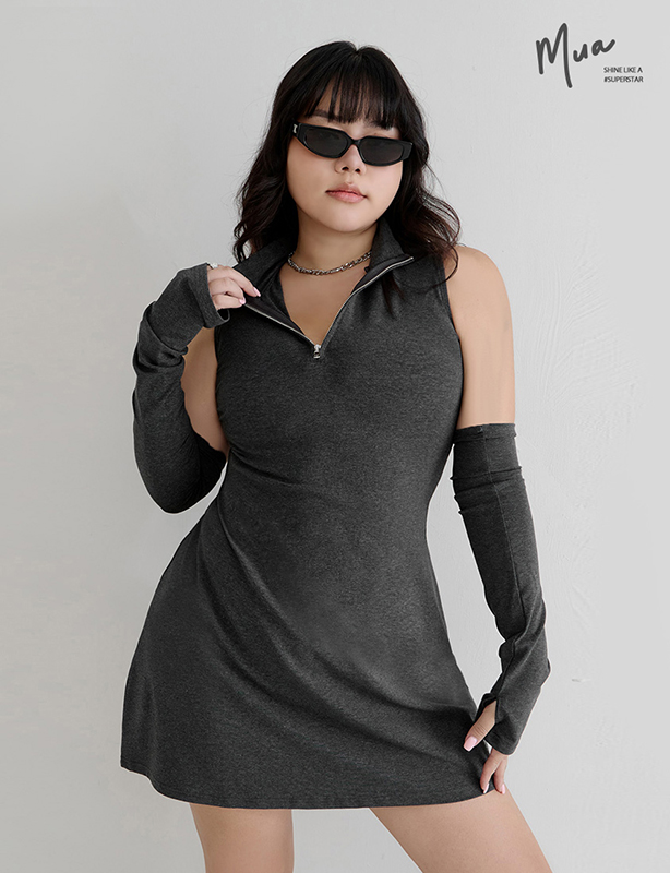 歐美立領拉鍊背心洋裝(附袖套) MUA