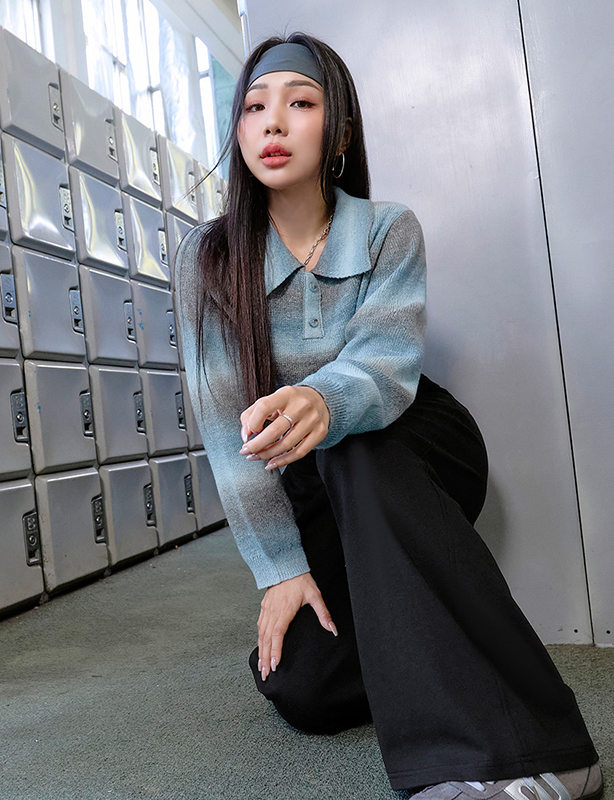 渲染條紋翻領針織上衣