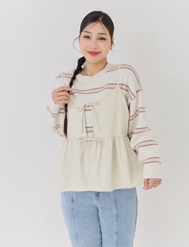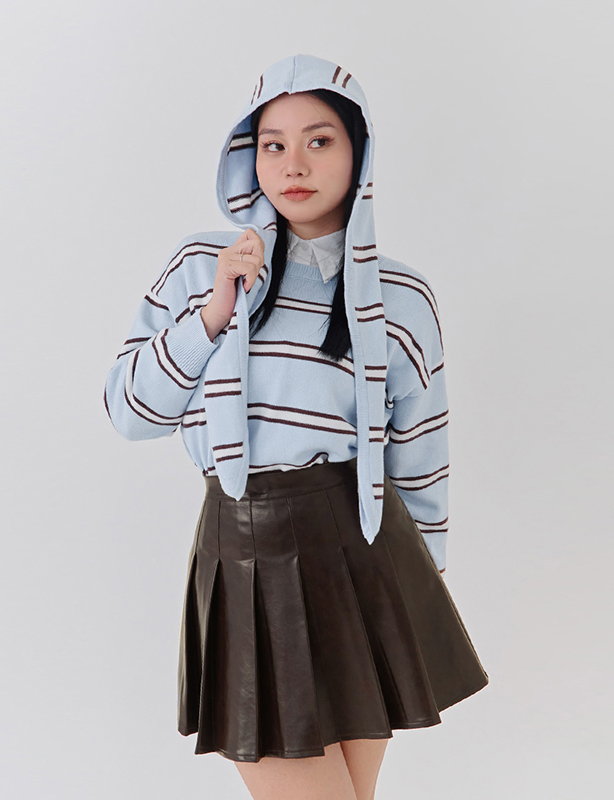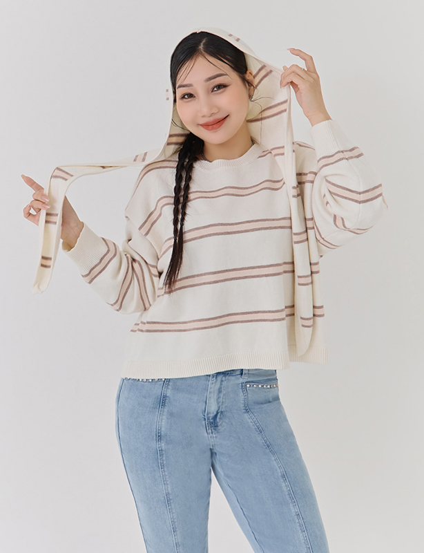 日系撞色條紋針織上衣(附連帽披肩)